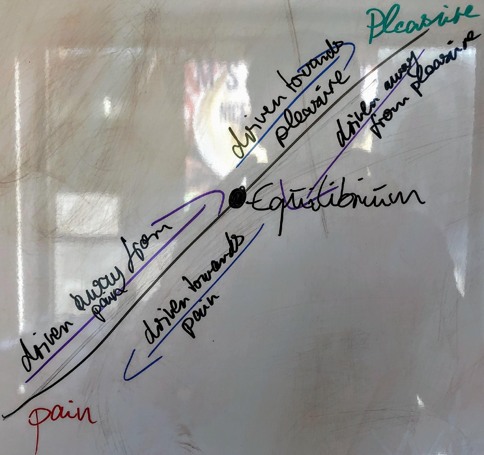 The arrows pointing into the other direction (driven away from pleasure or towards pain) are implied and I have no examples for them, yet, as this is ongoing research on my end. I haven’t seen anyone looking into that but suspect that these forces exist (according to Newton’s third law of motion that postulates that for each action there is an equal and opposite reaction2 ) and their exploration and awareness can help reach equilibrium in a more efficient manner3.